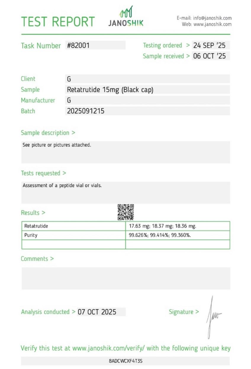 Our Retatrutide is tested in an independent laboratory and exhibits a purity exceeding 99%. Each batch is analyzed to ensure accuracy, consistency, and compliance with the most demanding research standards. Designed exclusively for research use.